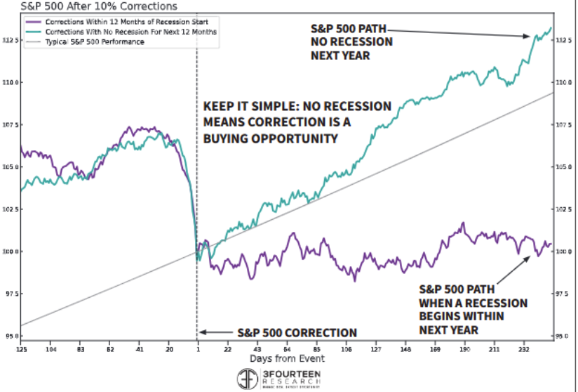 Historical data can offer valuable perspective. The chart below, courtesy of 3Fourteen Research, provides a fascinating look at how the S&P 500 has behaved after a 10% correction, specifically comparing scenarios where a recession followed within 12 months versus those where no recession occurred.